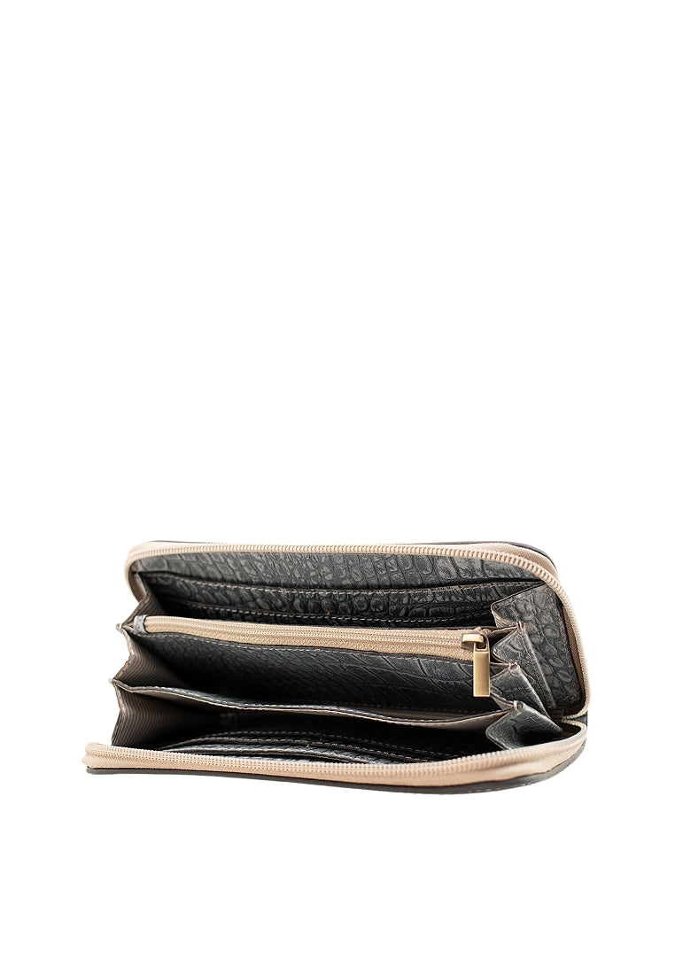 This wallet features four card slots on each side, offering ample space for your credit cards, ID, and other essentials. A dedicated section for paper bills keeps your cash neatly organized, while the middle compartment securely holds your coins and small valuables. The polished metal plate at the front adds a refined touch, and the durable nylon zipper closure ensures your items stay secure and easily accessible.