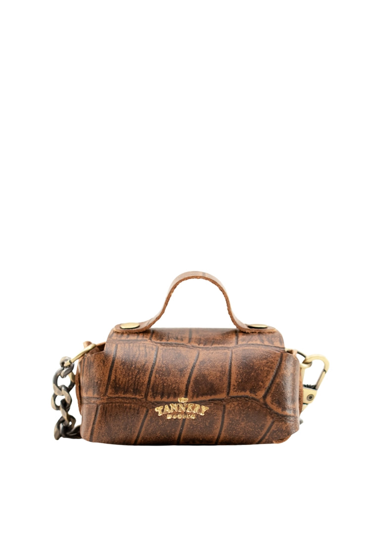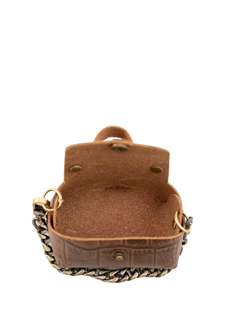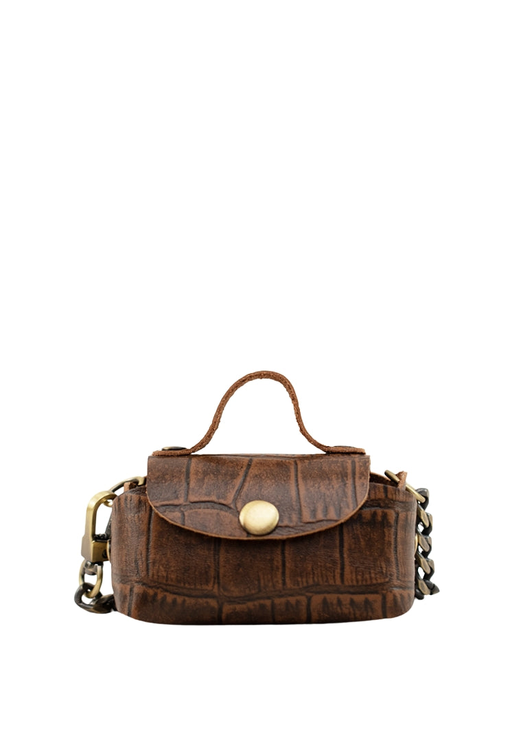 Featuring antique brass hardware and a secure snap-button closure. Its interior is perfect for storing earbuds or other small essentials, while the mini top handle and detachable chain strap offer versatile styling options. Finished with a gold embossed logo at the back, it’s a timeless blend of elegance, function, and craftsmanship.