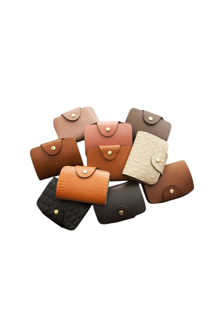 Crafted from cow leather, it features multiple clear flaps for organizing as much as 20 cards; you can also use it as a compact wallet.