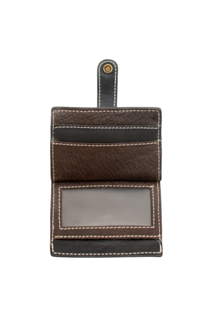 It features a subtle two-tone design and clean contrast stitching. It has multiple card slots for your daily cards, a snap-tab closure to keep everything in place, and an inside ID window for quick access. Slim, lightweight, and easy to slip into your pocket or small bag — simple, practical, and made for everyday use.