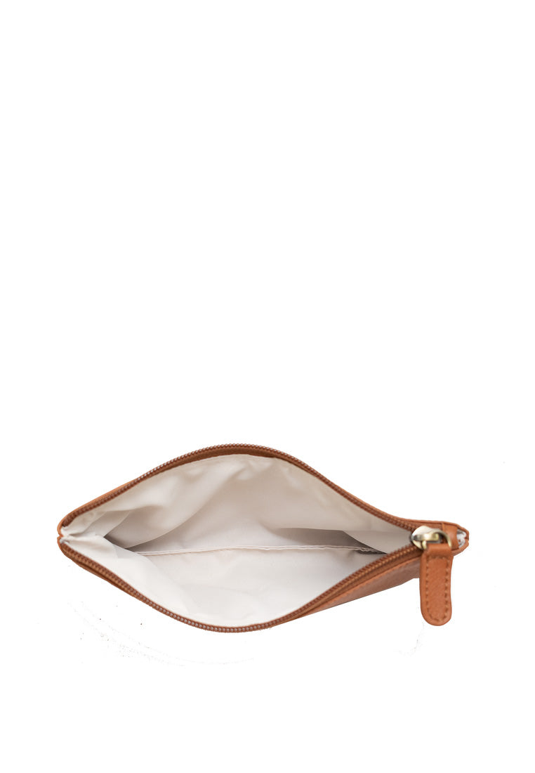 Take your essentials with this leather zippered pouch that keeps your bills and cards handy.