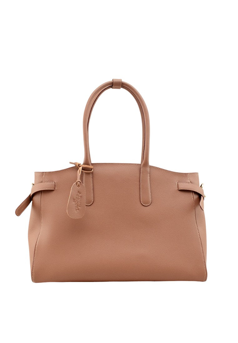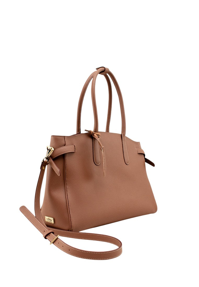 It features a spacious main compartment lined with soft fabric, complete with a zippered storage divided into two main compartments for your daily essentials. Designed with sturdy top handles and a detachable shoulder strap, it offers versatility and comfort in one elegant piece. Brass-tone hardware and fine stitching add the finishing touches — a polished, practical design made for the woman who carries her style with ease.