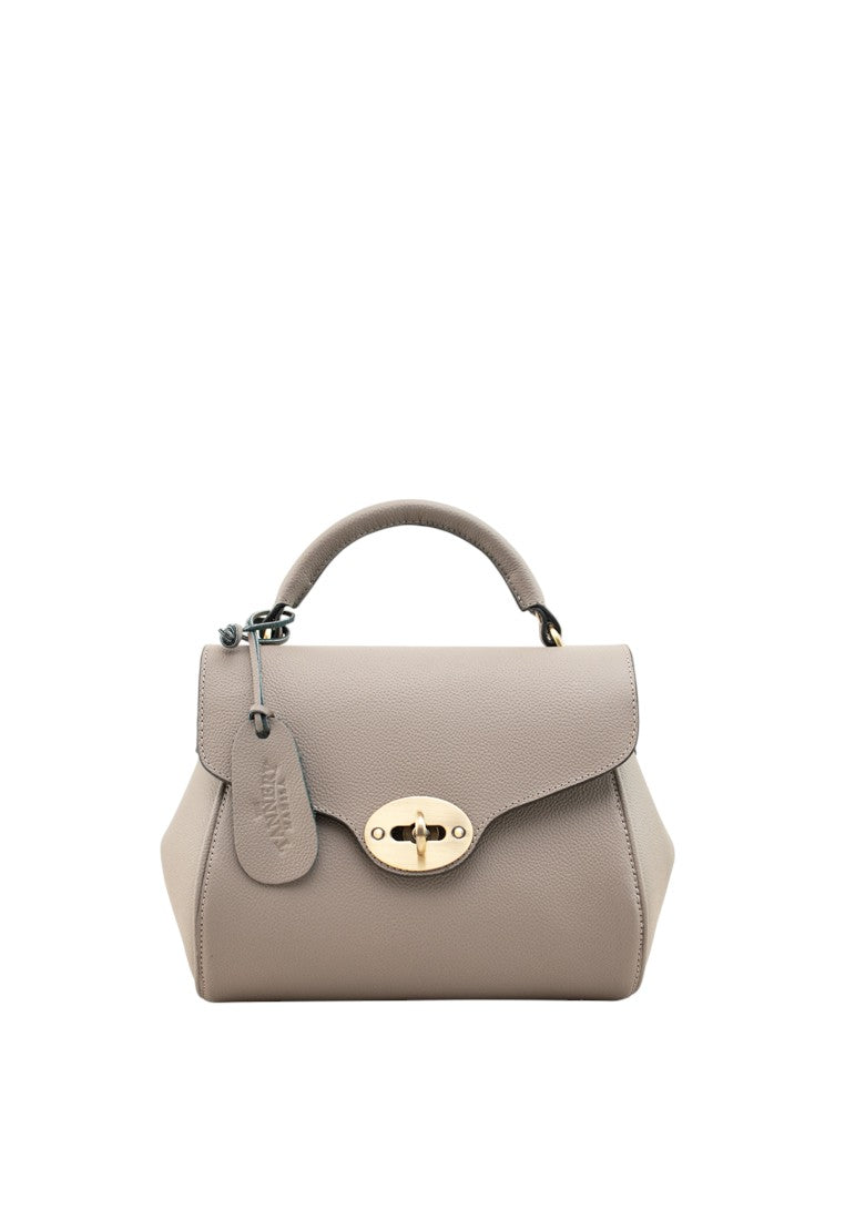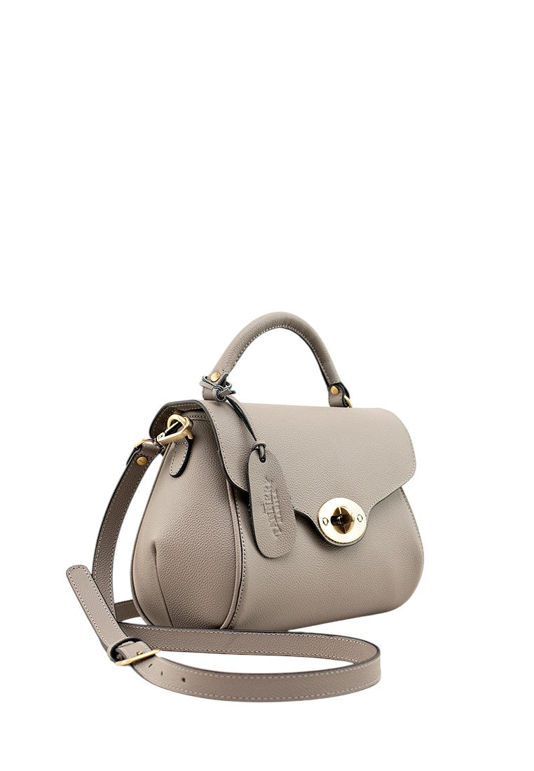 The Mavis features a front flap secured with a brass-tone twist-lock closure for a touch of understated luxury. Inside, the spacious compartment is lined with fabric and includes one zippered pocket and one open slip pocket to keep your essentials organized. This classic piece is designed with a sturdy top handle and side hooks for an optional shoulder strap, offering both style and versatility.