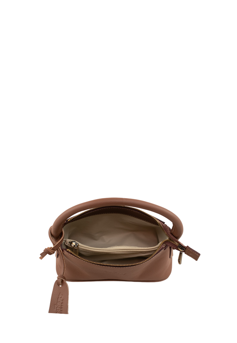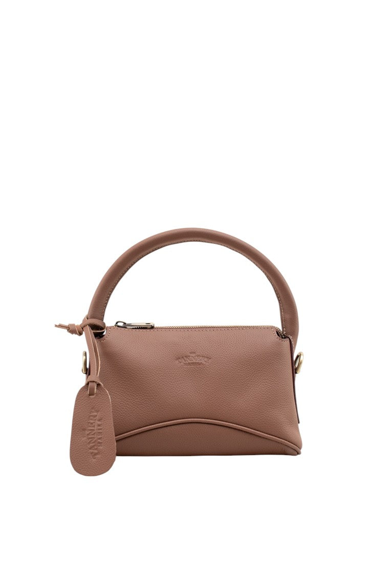 The Milly handbag is a compact, beautifully structured piece defined by its high-quality construction and versatility. Its design features a rounded, comfortable top handle for a classic, sophisticated carry, as well as a fully detachable and adjustable strap that allows for convenient shoulder or crossbody wear. All functional elements, including the smooth top zip closure and strap hardware, are finished in elegant brass-tone metal. The front of the bag is subtly embossed with the brand logo which is echoed on the stylish, removable leather charm. The interior is lined with a light-colored fabric and includes a necessary internal zip pocket to keep your essentials organized and secure. This mini bag is the epitome of quiet luxury, marrying practicality with timeless style.