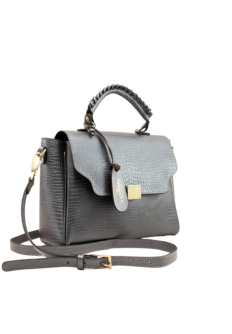 A lightweight medium size handbag roomy enough for a tablet, planner, wallet and other personal essentials; Pearly is a stylish work bag. Its design features a twist lock closure and top handles. The interior is lined with fabric with zippered and slip pockets to stay easily organized. Wear it on the crook of your arm as you strut across the boardroom or across your body when out and about.